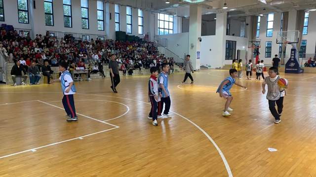 五年级的同学们技术更加娴熟,配合也愈发默契。他们巧妙地运用战术,时而快速突破,时而外线远投,精准的传球和精彩的进球赢得了在场同学和老师们阵阵欢呼。